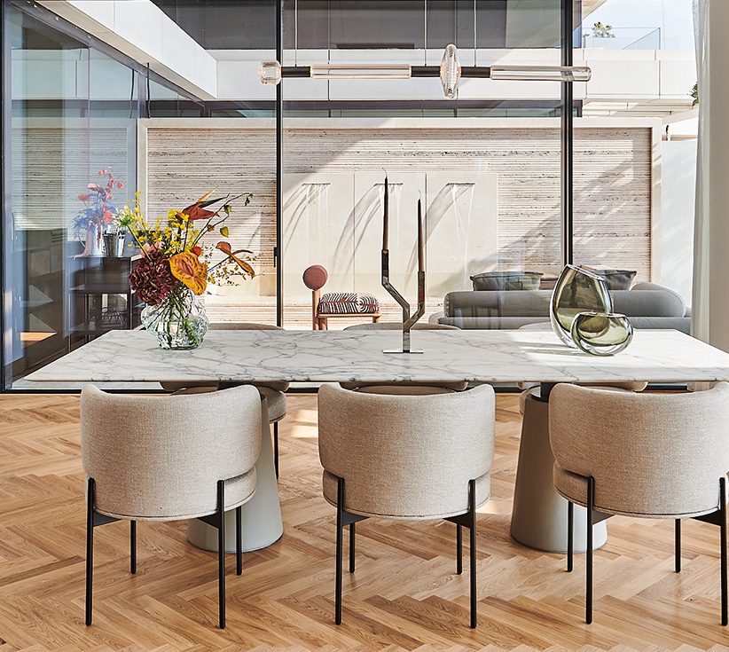 Kährs Studio Oak AB White Oil in herringbone forms the foundation of this One at Palm Jumeirah Residences penthouse by E + A Atelier, bringing a quiet sense of continuity and calm to the interiors. The soft, pale oak adds warmth without distraction, while its fine grain introduces subtle texture, keeping the overall palette balanced.