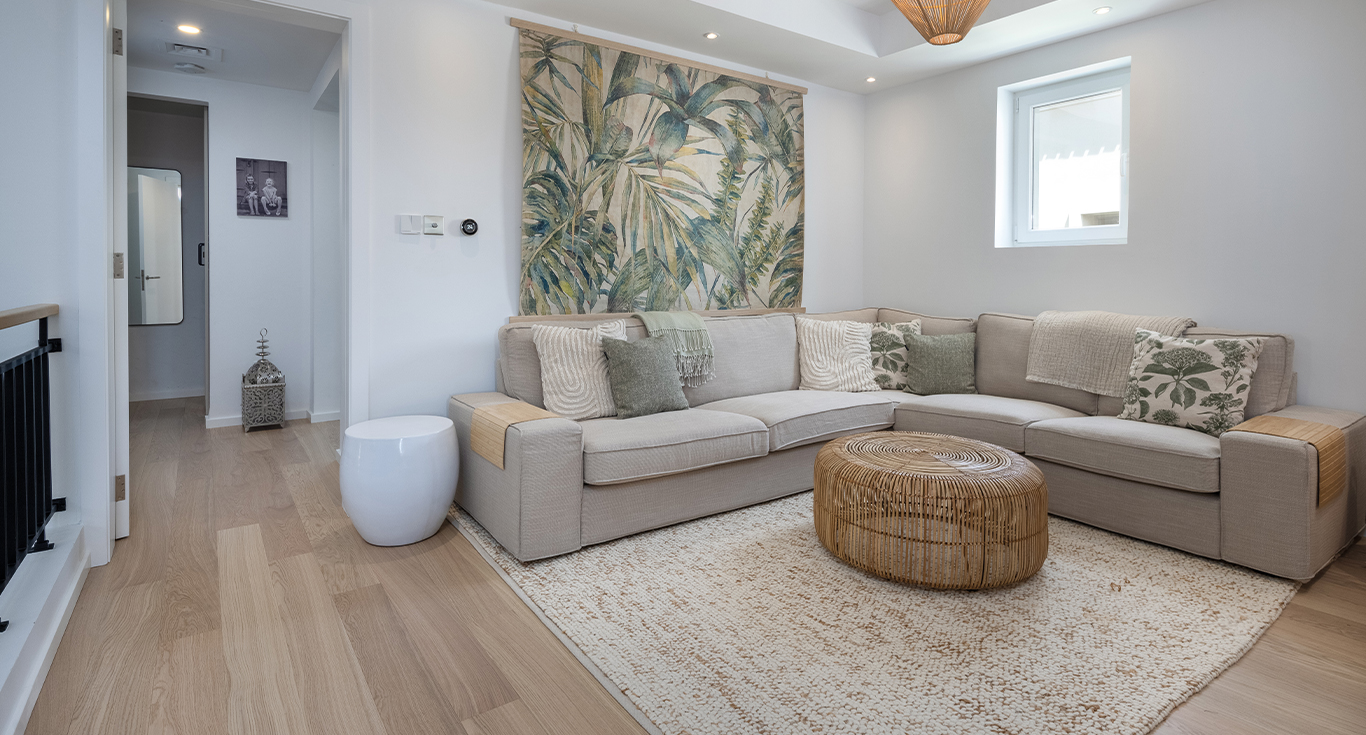 Our dark honey-coloured Kährs Sensation Intention LVT flooring is the perfect complement to this beautiful beige Fronteriors kitchen. Laid in a classic chevron pattern, it adds depth and elegance, enhancing the warm, inviting atmosphere of this Lakes townhouse. Meanwhile, the first floor of the family home features Whole Grain Wide – a wood floor reminiscent of grain swaying in the wind like fields of gold.